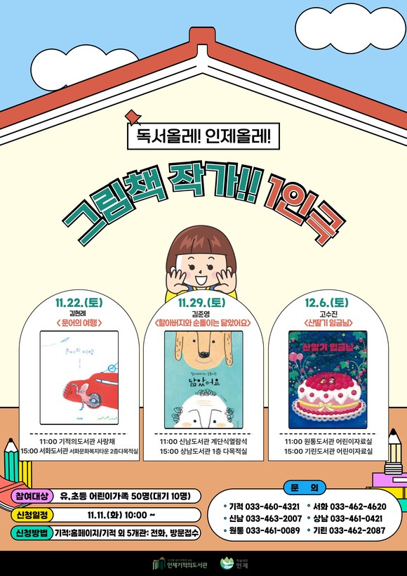 이어 29일 오전 11시 신남도서관과 오후 3시 상남도서관에서는 김준영 작가의 '할아버지와 순돌이는 닮았어요'가, 12월6일 오전 11시 원통도서관, 오후 3시 기린도서관에선 고수진 작가의 '산딸기 임금님'이 무대에 오른다.