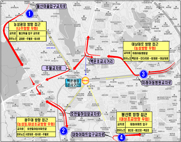 통제 구간 차량 우회도로는 ▲농성교차로에서 백운광장 방향 → 월산마을 입구 교차로에서 양궁장 방향 ▲광주대에서 백운광장 → 호반힐하임 교차로에서 양궁장 방향 ▲남광주(봉선·방림)에서 백운광장 → 미래아동병원 교차로에서 기독병원(수피아여고) 방향 ▲봉선동에서 백운광장 방향 → 대화아파트 입구 교차로에서 봉선중앙로(봉선초교) 방향 등이다.
