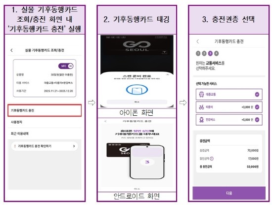 충전 방법도 편해졌다. 모바일티머니 앱을 실행하고 ‘실물 기후동행카드 조회/충전’ 메뉴를 선택한 후 실물 기후동행카드를 휴대폰 뒷면에 접촉하면 카드가 자동으로 인식되어 신용·체크카드나 오픈뱅킹을 통해 충전할 수 있다. 신규 충전과 재충전 모두 가능하다.