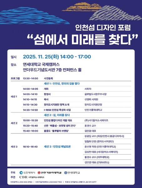 인천광역시는 오는 25일 연세대학교 국제캠퍼스에서 '인천섬 디자인 포럼'을 개최한다고 밝혔다.