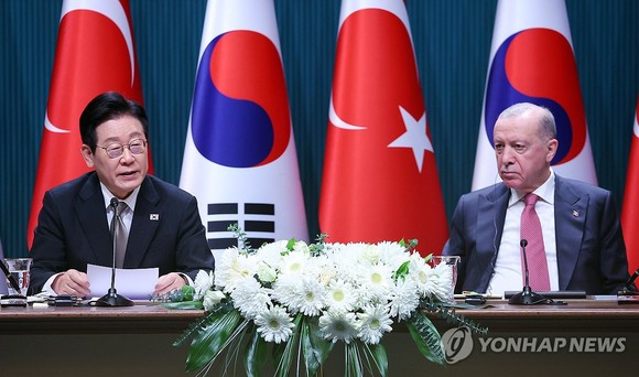 튀르키예를 국빈 방문한 이재명 대통령은 24일(현지 시간) 레제프 타이이프 에르도안 대통령과 103분 간의 정상회담을 마친 뒤 공동언론문을 발표했다.