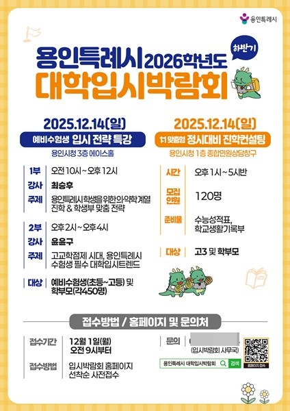 용인특례시는 오는 12월 14일 오전 10시부터 오후 5시 30분까지 시청 에이스홀과 종합민원상담창구에서 ‘하반기 2026학년도 대학입시박람회’를 연다고 25일 밝혔다. 이번 박람회는 예비수험생들에게 변화하는 입시 환경에 필요한 정보를 제공하고자 마련됐다.