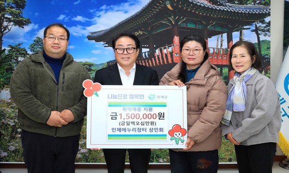 인제에누리장터 상인회(최성규 단장)은 25일 군청을 방문해 최상기 군수에게 지역의 어려운 이웃을 위해 써달라며 이웃돕기 성금 150만원을 기탁했다. 성금은 강원사회복지공동모금회를 통해 지역내 어려운 이웃을 돕는 데 사용될 예정이다.