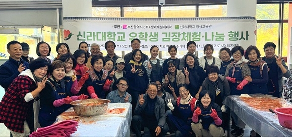 지난 22일 신라대 평생교육원 50+생애재설계대학 도시농업동아리 회원들은 ‘김장 체험 및 나눔 행사’를 개최해 외국인 유학생들에게 김장체험 기회를 제공하고, 라면·즉석밥 등 식료품을 전달했다.
