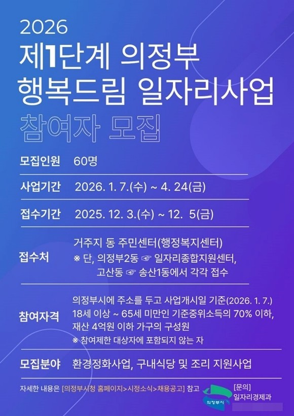 의정부시가 오는 2026년 제1단계 의정부 행복드림 일자리사업 참여자를 모집한다.