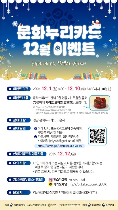 경남문화예술진흥원은 도내 문화누리 이용자를 대상으로 ‘2025 문화누리카드 12월 이벤트’를 내달 1일부터 10일까지 10일간 진행하며, 잔액 0원 인증 시 추첨을 통해 75명에게 케이크 모바일 교환권을 증정한다고 28일 밝혔다.