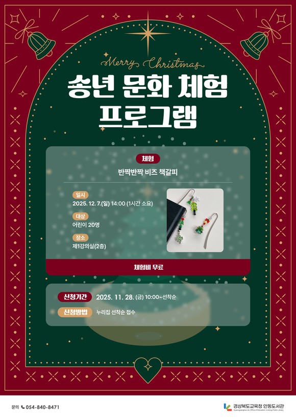 (CNB뉴스=신규성 기자) 경북교육청 안동도서관(관장 반선자)은 연말을 맞아 지역 주민들이 풍성한 문화 경험을 누릴 수 있도록 송년 문화 체험 프로그램을 운영한다.