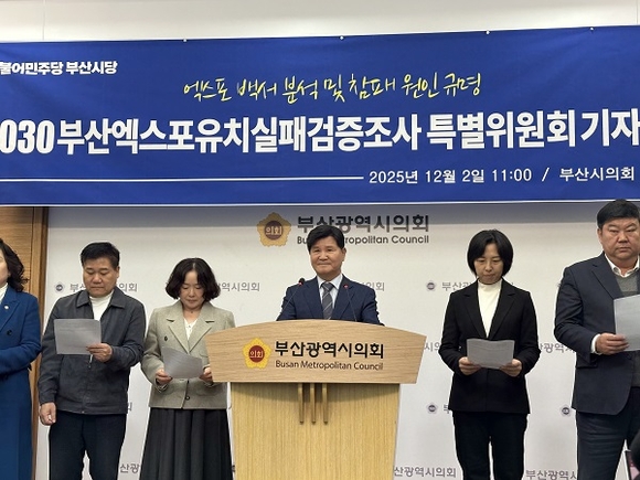 더불어민주당 부산시당이 2030 부산월드엑스포 유치 실패와 관련해 부산시가 최근 발간한 공식 백서를 ‘경과보고서 수준’으로 규정하며 전면 재검증에 나섰다. 민주당 부산시당은 2일 시의회에서 기자회견을 열고 ‘2030부산엑스포유치실패검증조사특별위원회’ 구성을 공식 발표하며 “부산시민과 국민이 납득할 수 있는 진실 규명에 끝까지 나서겠다”고 밝혔다.