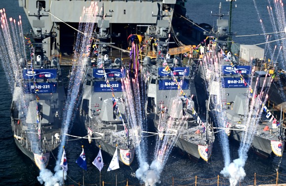 HJ중공업이 8일 해군의 연안방어 전력인 국산 신형고속정 4척의 통합진수식을 가졌다고 밝혔다.