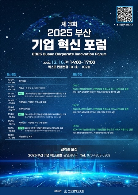 부산경제진흥원이 오는 16일 BEXCO 컨벤션홀에서 ‘제3회 2025 부산 기업 혁신 포럼’을 개최한다고 9일 밝혔다.