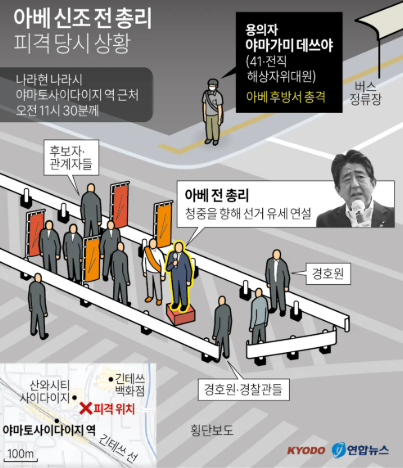 아베 전 총리가 피살된 나라시 야마토사이다이지 역 근처의 당시 상황 도해. (그래픽=연합뉴스)