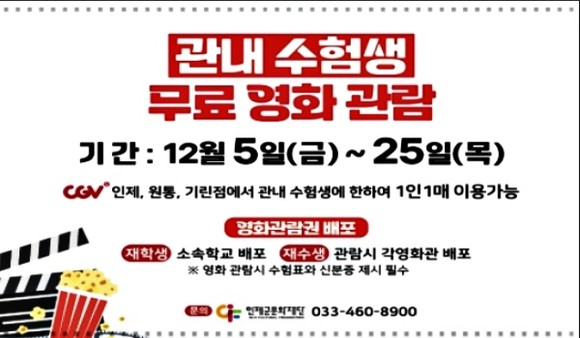 11일 재단에 따르면 오는 25일까지 수험표와 신분증을 지참한 수험생(재학생·재수생)은 CGV 인제점·원통점·기린점에서 무료로 영화를 관람할 수 있다.