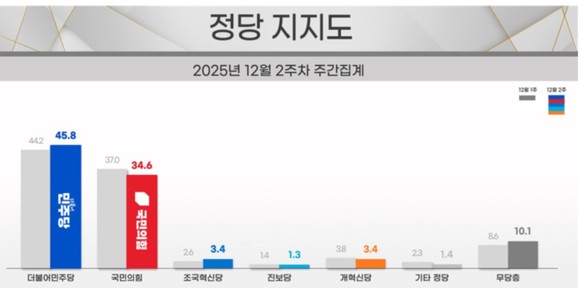 한편 리얼미터가 지난 11~12일 이틀간 전국 18세 이상 유권자 1010명을 대상으로 실시한 정당 지지도 조사에서는 더불어민주당이 전주 대비 1.6%p 상승한 45.8%를 기록한 반면, 국민의힘은 2.4%p 하락한 34.6%, 조국혁신당은 3.4%로 0.8%p 상승했으며, 개혁신당도 조국혁신당 지지율과 동일한 3.4%를 기록했고 진보당은 1.3%, 무당층은 10.1%로 집계됐다.