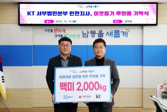 인천시 남동구는 최근 KT 서부법인본부 인천지사로부터 취약계층을 위한 백미 10kg 200포를 기탁받았다고 밝혔다.