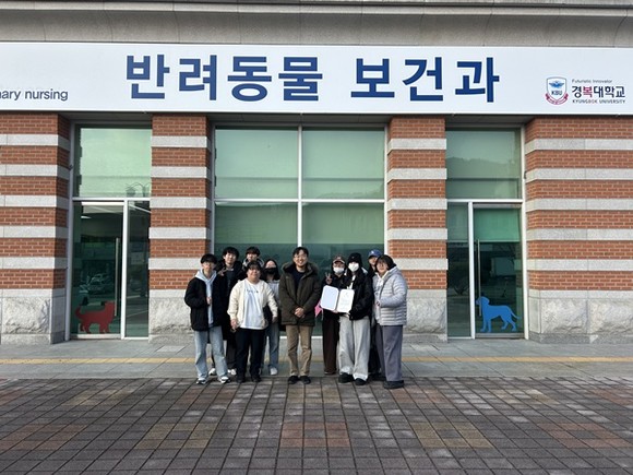 반려동물보건학과 강의실 앞에서 캡스톤디자인 수상을 기념했다. 이번 프로젝트에는 손서영, 장예은, 전동엽, 전솔미, 정수정, 정지현, 한성혁, 홍기한, 황윤서 등 총 9명의 학생이 참여했다.