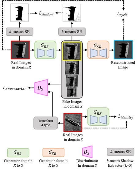 KIOST 해양력강화·방위연구부 이승훈 기술원 연구팀과 국립부경대학교 컴퓨터·인공지능공학부 장원두 교수 연구팀은 인공지능(AI) 이미지생성 모델인 ‘CycleGAN’을 기반으로 3D 모델링과 물리 기반 그림자 모델을 결합한 사이드스캔 소나 이미지 생성 기술을 개발해, 실제 해저 탐사 환경과 높은 유사도를 갖는 사이드스캔 소나의 이미지를 생성할 수 있는 새로운 기술적 기반을 마련했다.