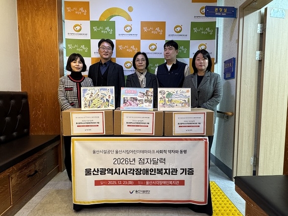 울산시설공단은 지난 23일 2025년 울산시립어린이테마파크 그림 그리기 대회 수상작을 활용해 제작한 점자 탁상달력을 지역 시각장애인 복지시설에 기증했다고 24일 밝혔다.