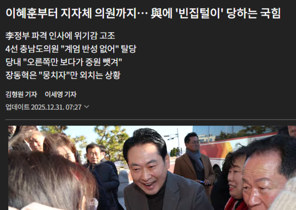 이혜훈 기획예산처 장관 후보자의 전격 지명 뒤 특히 보수 쪽에서 소란이 일고 있는 가운데, 조선일보는 31일 [이혜훈부터 지자체 의원까지… 與에 ‘빈집털이’ 당하는 국힘]이라는 기사를 냈습니다.