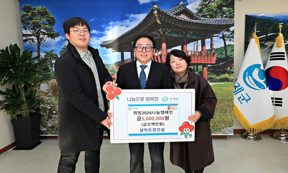 인제 김명옥 설악조경건설대표는 지난해 12월31일 인제군청을 방문해 어려운 이웃을 위해 써달라며 희망2026나눔캠페인 성금 500만원을 기탁했다.
