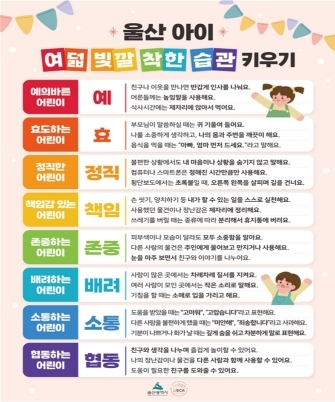 시 관계자는 “어린 시절 경험한 작은 실천이 평생의 인성으로 이어진다”며 “어린이집과 가정이 함께하는 인성교육을 통해 울산의 모든 영유아가 건전하고 올바른 인성을 갖춘 시민으로 성장할 수 있도록 지원하겠다”라고 말했다.