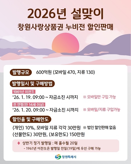 심동섭 경제일자리국장은 “설 명절을 앞두고 시민들의 소비 부담을 덜고 지역 상권에 활력을 더할 수 있도록 발행규모와 할인 혜택을 함께 고려했다”며 “앞으로도 시민이 체감할 수 있는 방향으로 창원사랑상품권을 지속적으로 확대·운영하겠다”고 말했다.