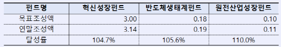 먼저 혁신성장펀드의 경우 3조원 목표에 3조1400억원을 조성해 104.7%의 달성율을 기록했고, 반도체생태계펀드와 원전산업성장펀드는 각각 105.6%, 110.0%로 초과했다.