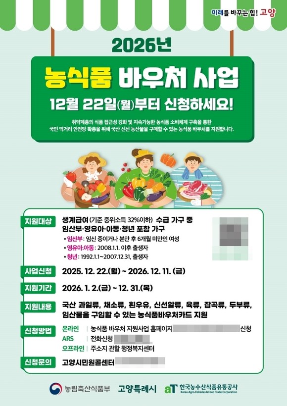고양시는 13일, 취약계층의 식생활 지원과 국산 농식품 소비 촉진을 위해 ‘농식품바우처 사업’을 확대 시행한다고 밝혔다. 올해부터 청년이 포함된 가구까지 지원 대상을 넓히고, 지원 기간도 오는 12월까지 12개월로 늘렸다.