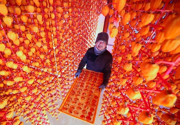 13일 경남 함양군 함양읍 곰실곶감농원 박효기 씨가 '제10회 지리산함양 고종시 곶감축제'에서 선보일 자연 바람에 잘 말린 고종시 곶감을 채반에 담아 들어 보이고 있다.