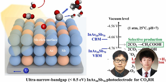 곽진성 교수 연구팀은 분자선 에피택시(molecular-beam epitaxy, MBE)를 이용해 InAs1-xSbx 합금 기반 광전극을 정밀하게 합성하고, 태양광 조사 조건에서 CO2 환원 실험을 수행했다. 그 결과, 특정 조성 영역에서 수소 발생 반응이 크게 억제되는 동시에 CO2가 액상 산소함유 화합물로 선택적으로 전환됨을 확인했다.