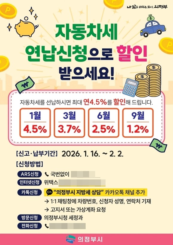 의정부시가 1월에 자동차세를 미리 납부하면 연간 세액의 최대 4.5%를 공제해준다. 정기분 납부보다 앞당겨 내는 방식으로, 신청과 납부를 모두 마쳐야 혜택이 적용된다.