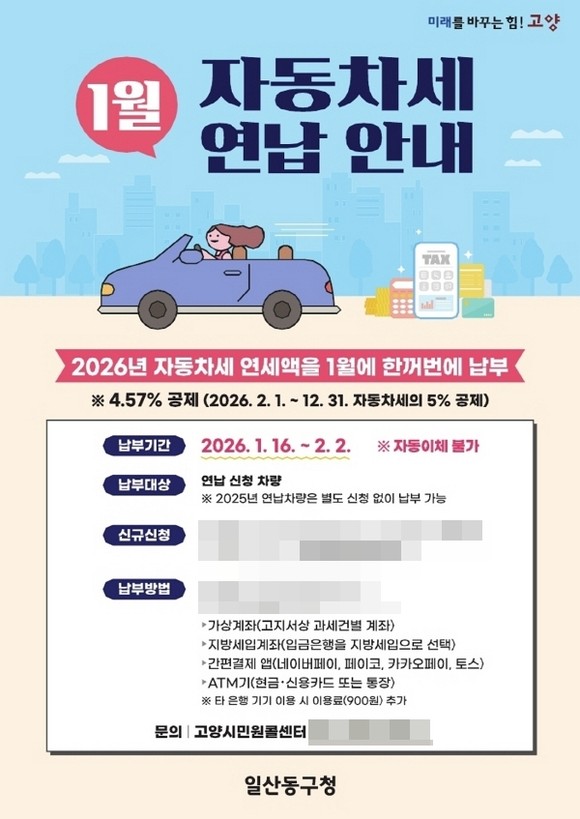 고양시 일산동구가 1월 자동차세 연납 신청을 받는다. 연납 신청 뒤 내달 2일까지 납부를 마치면 1년 세액의 약 4.5%를 공제받을 수 있다.