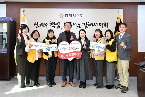 김해시의회는 지난 16일 시의회 의장실에서 대한적십자사 경남지사에 2026년도 적십자 특별회비를 전달하며 어려운 이웃을 위한 따뜻한 나눔에 동참했다.