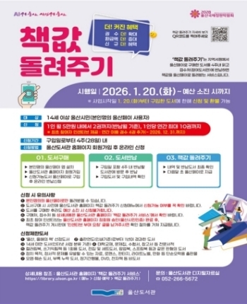울산도서관은 시민들의 독서 문화를 확산하고 지역 서점 활성화를 위해 추진 중인 2026년 ‘책값 돌려주기’ 사업을 1월 20일부터 시행한다고 밝혔다.