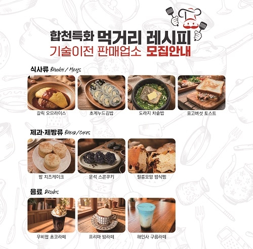 모집 대상은 합천군 내에 영업 신고가 된 일반음식점, 제과점, 휴게음식점 등이며, 기술이전을 통해 창업을 준비 중인 예비 창업자도 신청 가능하다.