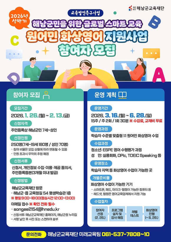 재단법인 해남군교육재단(이사장 명현관)은 상반기 원어민 화상영어 지원사업의 참여자를 모집한다.