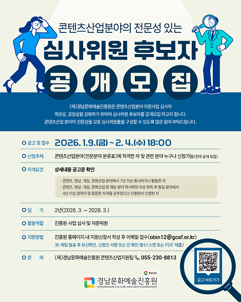 경남문화예술진흥원은 콘텐츠산업 분야 지원사업 심사의 객관성·공정성·전문성을 강화하기 위해 ‘콘텐츠산업 분야 심사위원풀(후보자)’을 공개 모집한다고 22일 밝혔다.