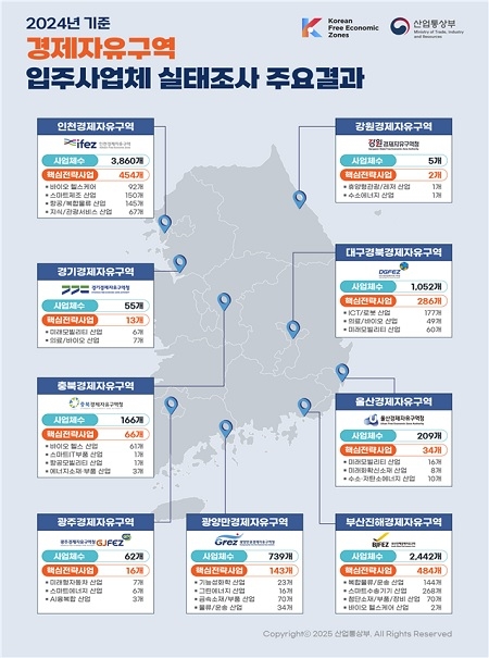 이번 조사는 경자구역에 입주한 종사자 5인 이상 사업체와 외국인투자기업의 경우 1인 이상 사업체를 대상으로 진행됐으며, 사업체 일반 현황과 고용, 매출, 투자, 수출입 등 총 56개 항목을 종합적으로 분석했다.
