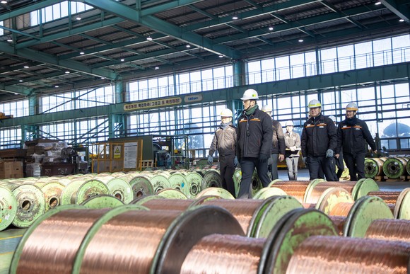 김대헌 사장은 먼저 케이블 공장을 찾아 미국·영국·싱가포르 등으로 수출하기 위해 현재 생산 중인 초고압 케이블의 생산 공정을 둘러보고, AI 기반 업무 자동화를 추진 중인 생산 라인의 자동화 설비 운영 현황을 확인했다.