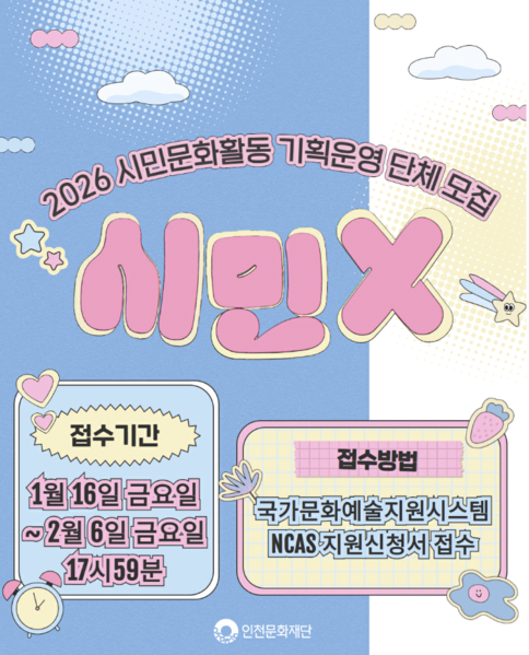 지원 신청 접수는 오는 2월 6일까지 국가문화예술지원시스템을 통해 진행된다. 자세한 내용은 인천문화재단 홈페이지에서 확인할 수 있다.
