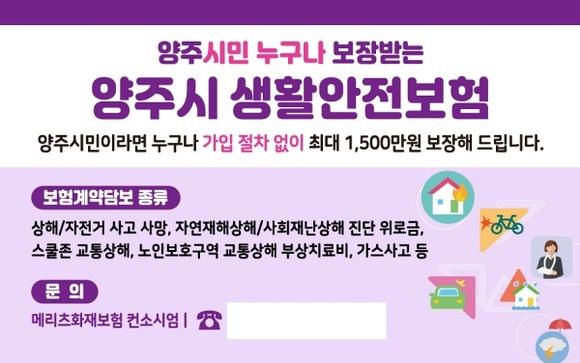 양주시 관계자는 “생활 속 사고와 재난으로 예기치 못한 어려움을 겪는 시민들이 일상으로 복귀하는 데 마중물 역할을 할 수 있도록 보험 제도를 운영하고 있다”며 “앞으로도 시민의 생명과 안전을 최우선으로 하여 안전한 양주시를 만드는 데 최선을 다하겠다”고 밝혔다.