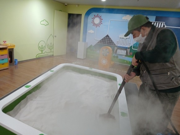 유아의 건강을 고려해 화학 약품 사용을 최소화하고 고온 스팀을 활용해 인체에 무해한 방식으로 소독을 진행했다. 특히, 유아들의 손이 많이 닿고 이용 빈도가 높은 실내 놀이, 체험 공간 전반에 걸쳐 집중적으로 방역을 마쳤다.
