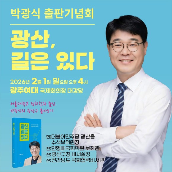더불어민주당 광산을지역위원회 박광식 수석부위원장은 오는 2월 1일 오후 4시 광주여자대학교 국제회의장 대강당에서 광주·전남 행정통합에서 광산의 역할을 ‘가교행정’으로 개념화 한 ‘광산, 길은 있다’ 출판기념회를 연다.