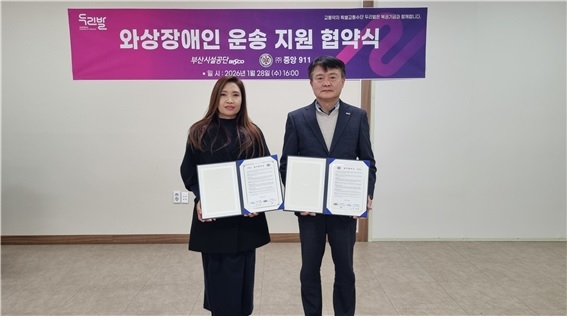 공단 주상무 복지문화본부장(우)과 유금자 중앙911 대표이사가 협약체결후 기념촬영을 하고 있다.(사진=부산시설공단 제공)