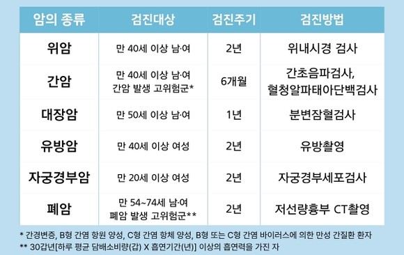 검진 대상 암종은 위암, 대장암, 간암, 유방암, 자궁경부암, 폐암 등 6종이며, 암종별로 연령, 성별, 검진 주기가 다르게 적용된다.