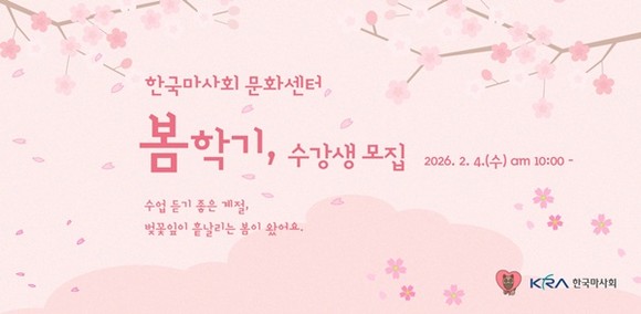 한편 2026년 봄학기 강좌는 오는 3월11일 개강이며, 수강 신청은 2월4일부터 한국마사회 문화센터 홈페이지 및 각 지사 안내 데스크를 통해 선착순으로 접수한다. 강좌별 일정, 수강료, 할인 대상 및 준비물 등 자세한 내용은 홈페이지 또는 가까운 한국마사회 지사 문화센터로 문의하면 된다.