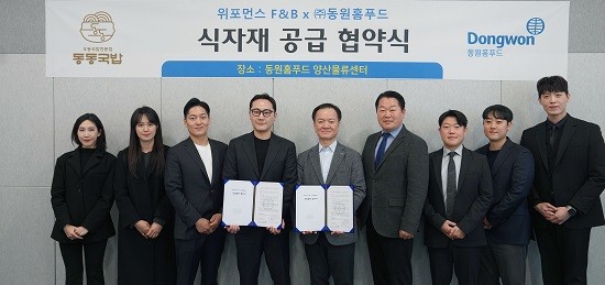 동원홈푸드와 위포먼스F&B는 지난 29일 경상남도 양산시에 위치한 동원홈푸드 양산물류센터에서 식자재 공급 협약을 체결했다. 이날 행사에는 박상천 동원홈푸드 외식식재사업부장과 위포먼스F&B의 조은빈·김영민 대표 등 양사 임직원들이 참석했다.