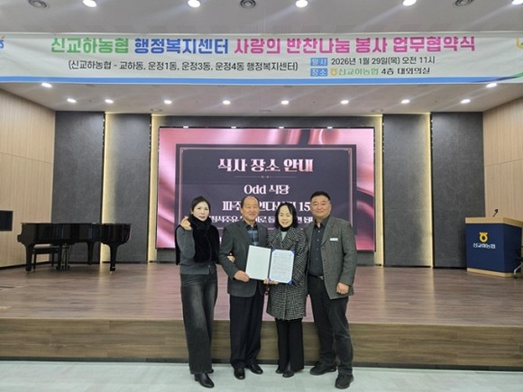 파주시 운정1동 지역사회보장협의체가 신교하농협 고향주부모임과 손잡고 취약계층 반찬 지원에 나선다. 양측은 지난달 29일, 신교하농협 대강당에서 업무협약을 체결하고, 홀로 지내는 어르신 등 저소득 가정을 대상으로 밑반찬을 정기 지원하는 민관 협력 사업을 추진하기로 했다.