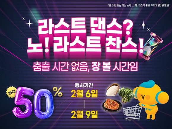 이번 기획전은 명절 직전까지 바쁜 일상으로 장보기에 여유가 없었던 소비자를 겨냥해 '라스트 댄스? 노! 라스트 찬스!_춤출 시간없음, 장 볼 시간임'이라는 유쾌한 콘셉트로 기획됐으며, 설 상차림에 필요한 고흥산 농수축특산물을 최대 50% 할인된 가격으로 선보인다.