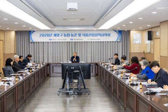 인천광역시 계양구는 농업의 지속 가능한 발전과 농업인의 소득 안정, 안전한 농식품 공급 기반 마련을 위해 구청 영상회의실에서 2026년 농업-농촌 및 식품산업 정책심의회를 개최했다.