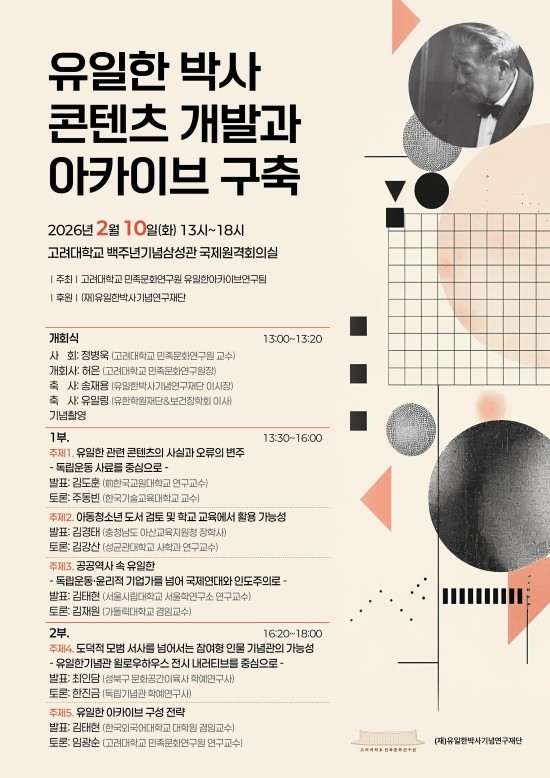 고려대학교 민족문화연구원이 오는 2월 10일 백주년기념삼성관 국제원격회의실에서 ‘유일한 박사 콘텐츠 개발과 아카이브 구축’ 학술회의를 개최한다고 5일 밝혔다.